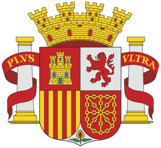 cuartelados, los estandartes de Castilla (cuartel 1), León (cuartel 2), Aragón (cuartel 3), Navarra sin la esmeralda (cuartel 4), y Granada en punta; acoladas, la columnas de Hércules, sin coronas, basadas en tierra y con un unico listón entrelazándolas con la leyenda latina ‘Plus ultra’ («Más allá»); al timbre, corona mural genérica de cuatro torres. Colores heráldicos utilizados: oro, plata, gules (rojo), azur (azul) y sinople (verde)».