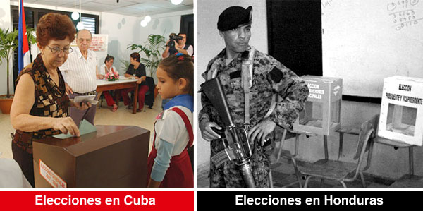 Aunque la realidad y las imágenes parecen demostrar justamente lo contrario, la mayoría de los medios de comunicación (al igual que el Departamento de Estado de EEUU) valoran positivamente el reciente proceso electoral orquestado por los golpistas en Honduras… y al mismo tiempo siguen difundiendo de forma recurrente el mensaje de que «Cuba es un régimen dictatorial en el que no hay elecciones libres».