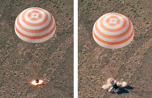 Esta doble imagen que hemos compuesto a partir de sendas fotografías aéreas muestra la secuencia final de aterrizaje del módulo de mando de la nave Soyuz TMA-17 procedente de la Estación Espacial Internacional (ISS). Izquierda: instantes antes de la toma de tierra, a poco más de un metro de la superficie, un sofisticado sistema automático basado en un altímetro de rayos gamma hace que se enciendan los cohetes de frenado para reducir la velocidad de descenso del módulo. Podemos distinguir con claridad el resplandor provocado por la ignición del combustible sólido. Derecha: En el momento justo de tomar tierra, la Soyuz levanta una gran polvareda sobre la árida estepa de Kazajistán (Asia central).