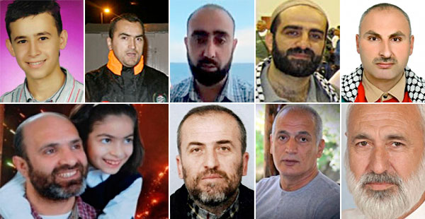 De izquierda a derecha y de arriba a abajo: Furkan Dogan (estudiante de 19 años nacido en EEUU; iba a estudiar Medicina el curso que viene; según la autopsia¹ recibió cinco disparos a muy corta distancia: dos en la cabeza, dos en una pierna y uno en la espalda; deja padre, madre y dos hermanos), Necdet Yildirim (trabajador de IHH —ONG turca de ayuda humanitaria— de 32 años, deja mujer y una pequeña, Melek, de 3 años), Cevdet Kiliçlar (trabajador de IHH de 38 años, periodista y fotógrafo; recibió un tiro en la cabeza a corta distancia; deja mujer y dos hijos → sus trabajos en Flickr), Alí Haydar Bengi (comerciante de 39 años, licenciado en Literatura Árabe por la Universidad de El Cairo, deja mujer y cuatro hijos), Fahri Yaldiz (bombero de 43 años, deja mujer y cuatro hijos), Cengiz Akyüz (41 años; en la imagen, con su hija abrazada a él; deja mujer y tres hijos), Cengiz Songür (47 años, deja mujer y siete hijos), Çetin Topçuoglu (54 años, entrenador de la Selección Nacional de Taekwondo de Turquía y ex-futbolista, deja mujer —uno de los supervivientes de la matanza— y un hijo → su página en Facebook) e Ibrahim Bilgen (61 años, destacado miembro de la Cámara de Ingenieros Electrónicos de Turquía; según la autopsia recibió cuatro disparos: en la sien, en el pecho, en la cadera y en la espalda; deja mujer y seis hijos).