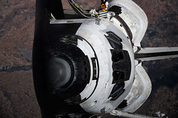 El Shuttle Atlantis de la NASA, con su cabina en primer plano, acercándose a la ISS durante la que ha sido la última expedición de este veterano transbordador espacial, la misión STS-132. [Foto: Oleg Kótov / Roscosmos]