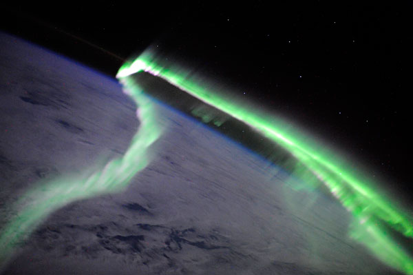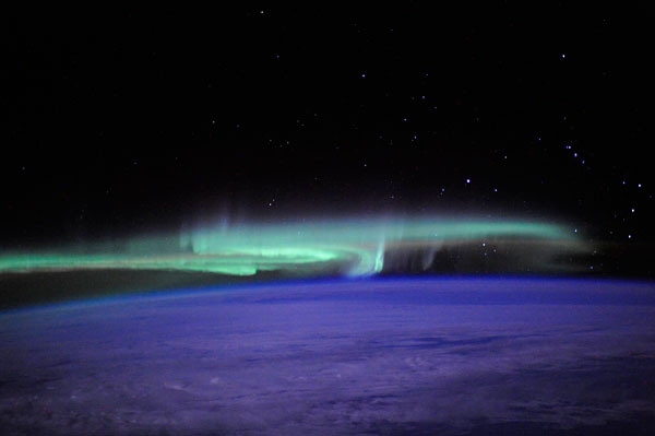 Una aurora polar vista desde la ISS. Las auroras son un fenómeno luminiscente en el cielo nocturno, visible habitualmente en las zonas cercanas a los polos, causado por la colisión de partículas solares con carga eléctrica con el campo magnético y la ionosfera de la Tierra. [Foto: Oleg Kótov / Roscosmos]