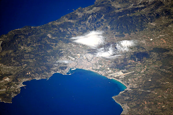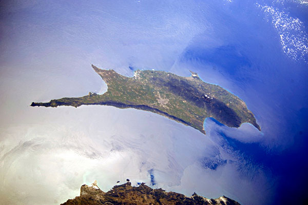 La isla mediterránea de Chipre «boca abajo», con el Sur en la parte superior de la imagen. En la parte inferior se observa una porción de la península asiática de Anatolia correspondiente a la antigua región de Cilicia, en la actual Turquía. [Foto: Oleg Kótov / Roscosmos]