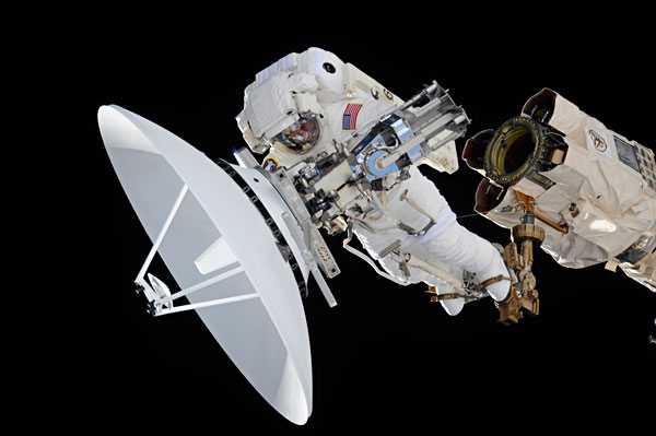 Actividad extravehicular (EVA, por sus siglas en ingles) del astronauta de la NASA Garrett Reisman (misión STS-132, 17-05-2010) portando una nueva antena para su instalación en la estructura tubular central de la ISS. El operario espacial está sujeto con unas abrazaderas por sus botas al brazo robótico que le sostiene e impulsa durante la maniobra. [Foto: Oleg Kótov / Roscosmos]