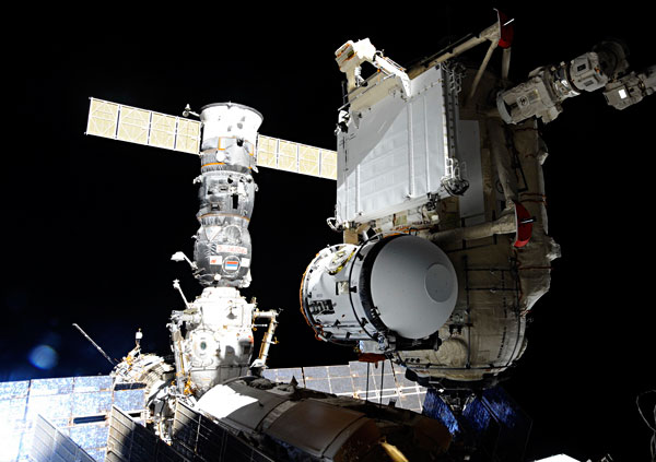 En primer plano, el nuevo módulo Rassvet, portado por el brazo robótico de la ISS, durante la fase final de la maniobra que culminó con su acoplamiento al módulo Zaryá (parte inferior de la imagen), en el segmento ruso del complejo orbital. En segundo plano, a la izquierda, destaca un carguero espacial automático Progress acoplado a la ISS. [Foto: Oleg Kótov / Roscosmos]