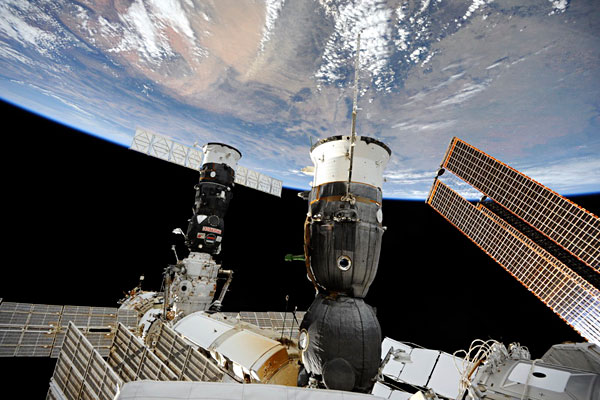 De izquierda a derecha —con la Tierra como fondo—, un carguero automático Progress y una nave tripulada Soyuz (en primer plano) acopladas en el segmento ruso de la ISS. Por la derecha de la imagen asoma uno de los juegos de paneles solares fotovoltaicos orientables fijados a la estructura central de la Estación. [Foto: Oleg Kótov / Roscosmos]