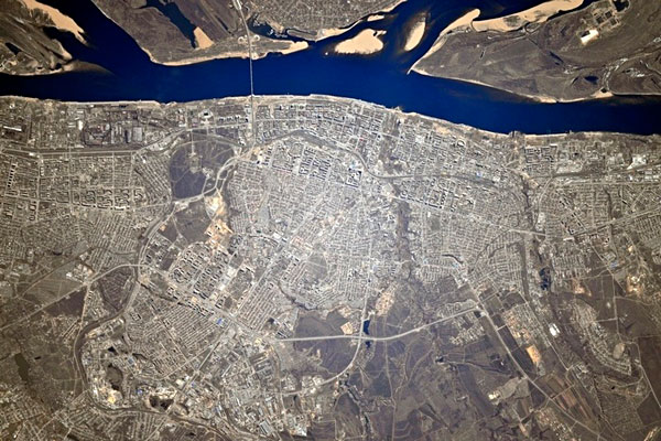 Nítida fotografía de la famosa ciudad industrial rusa de Volgogrado (Stalingrado entre 1925 y 1961, en torno a un millón de habitantes en la actualidad) extendiéndose sobre una de las orillas del río más largo de Europa, el Volga, que se muestra aquí con un azul intenso. Éste fue el escenario de la batalla más decisiva de la Segunda Guerra Mundial, la Batalla de Stalingrado (1942-43), que se saldó con una aplastante victoria de las fuerzas soviéticas sobre las tropas nazis que dio el vuelco definitivo a la contienda en Europa. [Foto: Oleg Kótov / Roscosmos]