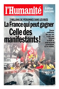 ‘La Francia que sí puede ganar’. Siguiendo la estela de los trabajadores griegos, el 24 de junio millones de franceses tomaron las calles durante una «Jornada nacional de acción» contra los planes de recortes sociales de la UE y el FMI que pretende aplicar el gobierno conservador de Nicolás Sarkozi. La movilización, promovida por el sindicato mayoritario CGT (Confederación General del Trabajo) y otras organizaciones de la izquierda sindical y política, ha tenido como lemas principales la defensa de las pensiones y jubilaciones [retraites en francés] de la clase trabajadora frente a los planes gubernamentales de aumentar la base de años cotizados para alcanzar el 100% de la pensión, así como el rechazo frontal al retraso de la edad de jubilación de los trabajadores franceses desde los 60 años actuales hasta los 62 años. En la vecina España, el gobierno del PSOE (con el apoyo de los grandes empresarios de la patronal CEOE) se propone elevar esta cifra hasta los 67 años y, además, ha congelado las pensiones, ha rebajado los sueldos de los funcionarios y ha abaratado el despido a los empresarios por Decreto-Ley.