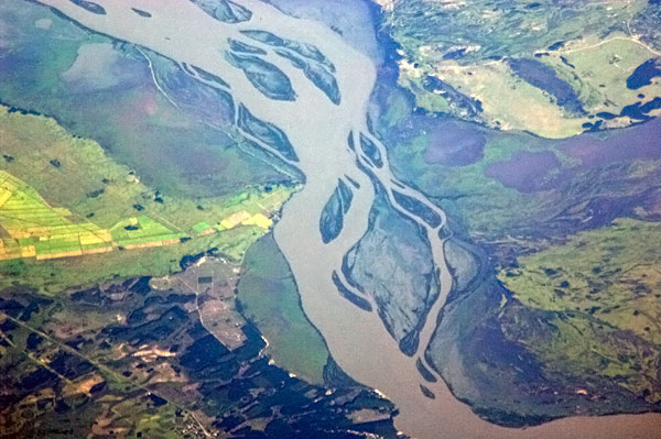 Una parte de la cuenca del Amazonas, el río más caudaloso de la Tierra y el más largo de las Américas. Los efectos de la deforestación agrícola humana son claramente visibles en amplias zonas cercanas a su ribera, antes cubierta por una espesa selva tropical.