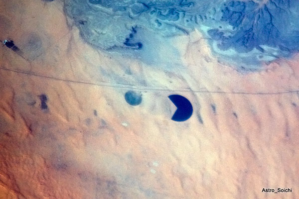 Pie de la foto: «Cultivos de regadío en pleno desierto de Arabia. […]». La foto la hizo Soichi Noguchi, como todas y cada una de las 30 publicadas en CF.