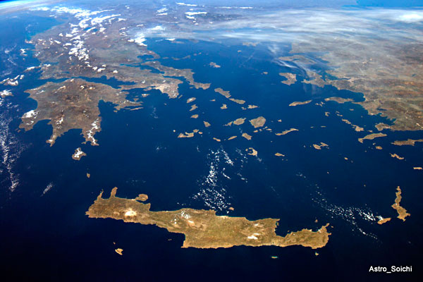 Amplio panorama del Mar Egeo (Mediterráneo Oriental) flanqueado por las penínsulas de Grecia (Europa) y Anatolia (parte asiática de Turquía) a la izquierda y a la derecha, respectivamente. En el centro de la imagen se distinguen gran parte de las numerosas Islas Griegas, destacando Creta —la mayor de ellas— en primer plano en parte inferior de la foto.