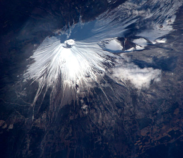 A modo de merecido tributo al cosmonauta japonés Soichi Noguchi, cerramos esta primera entrega de sus fotos con esta imagen del símbolo del País del Sol naciente visto desde la órbita terrestre. El Monte Fuji (Fujisan, en japonés; también conocido como «Fujiyama») es la mayor cumbre de las islas japonesas (3.776 m) y está considerado sagrado por el pueblo nipón desde tiempos remotos. A pesar de su nombre, el Fuji es en realidad un volcán. En esta instantánea captada por Noguchi el pasado 30 de marzo Fujisan nos deslumbra con su serena belleza cuando aún se encontraba casi completamente cubierto de nieve al inicio de la primavera en Japón.
