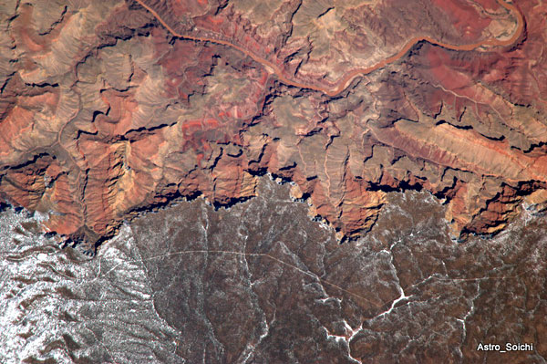 El Gran Cañón del Colorado (Arizona, EEUU; Grand Canyon en inglés) es posiblemente la formación geológica más espectacular de la Tierra. Se trata de una escarpada garganta de gran desnivel producto de la erosión ejercida sobre el terreno durante millones de años por el río Colorado, bautizado así por los españoles por obvio motivo y que en la imagen hace honor a su nombre (parte superior de la foto). Si no fuera por las rectilíneas huellas humanas marcadas en el terreno por las carreteras del altiplano y que se pueden distinguir en el tercio inferior de la foto, la imagen podría confundirse con un paisaje de Marte, el «planeta colorado».