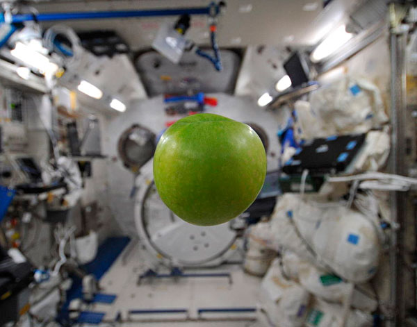 Esta hermosa manzana, que bien podría haber sido la legendaria «manzana de Newton», no está infringiendo la Ley de la Gravitación Universal con su aparente ingravidez (estado de caída libre, en realidad) en el laboratorio japonés Kibo de la Estación Espacial Internacional (ISS). Más bien confirma las teorías del genial físico y matemático británico nacido en el siglo XVII, a pesar de que el fruto —lejos de la campiña inglesa— no termine de caerse al «suelo» en el siglo XXI. [Vía: lifeinspace]