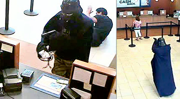 Según titula NYDailyNews.com [la noticia es real] «Un hombre disfrazado de Darth Vader roba un banco de Long Island [Estado de Nueva York] a punta de pistola y empuja a un cliente al suelo», utilizando el lado oscuro de La Fuerza, añadiríamos. Según informa la web del rotativo neoyorkino, cuando «Darth Vader» entró en la sucursal bancaria el pasado miércoles, un cliente empezó a bromear con el susodicho «pensando que no se trataba de un robo de verdad» —declaró a la prensa el sargento de la polícía del Condado, William Cordero. Pero Darth Vader —como todos deberían saber— nunca bromea y abatió al cliente [en la imagen de la izquierda] con un certero golpe con su arma, que en este caso no era una espada láser. El ladrón huyó con rapidez del lugar de los hechos a pie después de apoderarse de una cantidad no determinada de dinero en dólares del Imperio… terrestre. El detective Cordero está investigando a cuánto asciende el botín así como el paradero de nuestro Darth Vader… quien a estas alturas quizá ya se encuentre en algún remoto confín de la Galaxia. [Imágenes: vídeo de seguridad de la oficina bancaria, 21/07/2010]