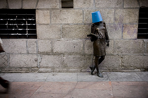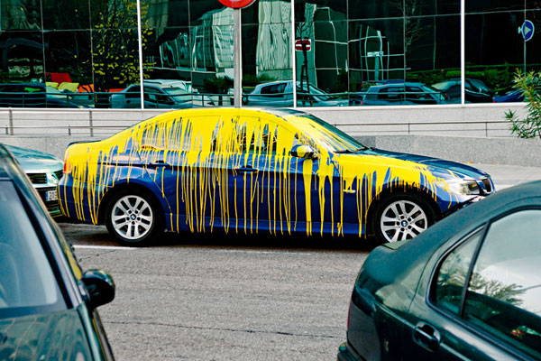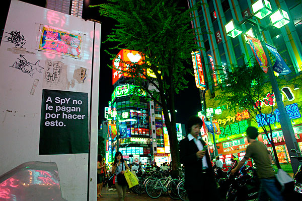 Pero sus intervenciones no son las típicas a las que estamos acostumbrados por estos lares, embobadas y embebidas de un nihilismo tan híper-abstracto como híper-absurdo e híper-subvencionado por los poderes establecidos. El arte de SpY es subversivo en el mejor de los sentidos, precisamente el sentido que le da a ese término la parte contraria. Aunque a la vez su mensaje de fondo es constructivo, porque nos hace reflexionar e imaginar alternativas transformadoras. SpY denuncia el consumismo y la publicidad irracional, hace mofa del sistema financiero, descarga un sano odio contra el entorno urbano hostil de las grandes ciudades, invadidas por los automóviles y las cada vez más omnipresentes cámaras de vigilancia… todo ello escenificado con los toques de humor, cosmopolitismo, autosuficiencia e ironía presentes en los genes que definen el carácter de los madrileños. A continuación compartimos con vosotros una muestra lo suficientemente representativa (17 imágenes) del intenso y extenso trabajo de SpY en varias ciudades del mundo (Madrid, Bilbao, Ámsterdam, Nueva York, Tokio)…