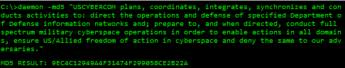 Lo que traducido al castellano vendría a significar: «USCYBERCOM planea, coordina, integra, sincroniza y dirige actividades para: poner en marcha las operaciones y defender las redes de información especificadas por el Departamento de Defensa y estar dispuestos, cuando sea oportuno, a ejecutar una amplia variedad de operaciones militares en el ciberespacio con el fin de desarrollar acciones en todos los dominios, asegurar la libertad de acción a EEUU y aliados en el ciberespacio e impedir lo mismo a nuestros adversarios.»… negro sobre blanco (una vez desencriptado, claro), por lo que no creemos que sea necesario añadir nada más.