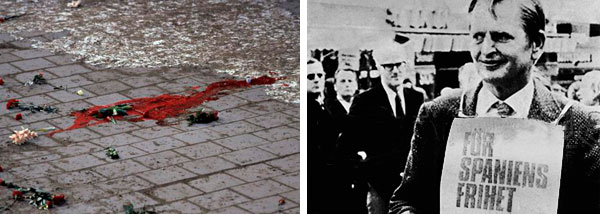 Izquierda: Lugar del asesinato de Olof Palme en las cercanías de una estación de Metro de Estocolmo cuando caminaba sin escolta en compañía de su mujer Lisbet, herida en el atentado. En la actualidad sólo una modesta y escueta placa que reza «På denna plats mördades sveriges statsminister Olof Palme» [«En este lugar fue asesinado el primer ministro sueco Olof Palme»] recuerda el magnicidio. Gene Tatum, ex agente de la CIA, confesó en una entrevista radiada en Los Ángeles que ‘la Agencia’ estuvo implicada en la eliminación de Palme. Derecha: El primer ministro sueco se manifiesta en 1975 por las calles de Estocolmo «Por la libertad de España».