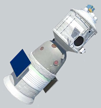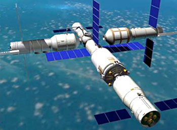 Representación de un proyecto de estación espacial multimodular china cuya puesta en marcha estaría prevista para los próximos años, no mucho más allá de 2020. Está basado en un módulo central de más de 20 toneladas dotado con seis puertos de atraque (cinco en la ‘proa’ y uno en la ‘popa’) muy similar —al menos por su aspecto— al Módulo Base de la Estación soviética Mir o al Módulo Zvezda de la ISS. Este complejo orbital tripulado y multimodular chino podría tener unas características y dimensiones parecidas al complejo espacial soviético-ruso Mir que con tan magníficos resultados orbitó la Tierra entre 1986 y 2001 [véase al respecto en Ciudad futura: Dossier Mir].