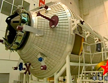 Módulo habitable (presurizado) del laboratorio orbital Tiangong en lo que parece ser una sala de su planta de montaje según imágenes emitidas por los informativos de la cadena pública china CCTV. Pueden verse en primer plano los sistemas de cita espacial y de acoplamiento de naves, similar este último al APAS-89 de diseño soviético.