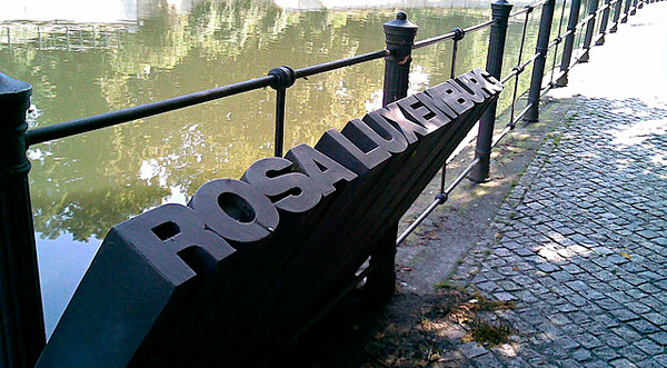 Monumento actual a Rosa Luxemburgo en la orilla de un canal del distrito de Tiergarten (sur de Berlín), lugar donde fue arrojado el cadáver de la líder comunista tras ser asesinada junto a su camarada Karl Liebknecht. El artista quiso plasmar el nombre de Rosa emergiendo de las aguas del canal como una alegoría del futuro.