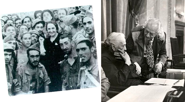 Izquierda: Dolores rodeada de milicianos del Ejército Popular de la República durante una de sus muchas visitas a los frentes de la Guerra de España. Derecha: Dolores Ibárruri y el poeta Rafael Alberti, ambos recién elegidos diputados comunistas por Asturias y Cádiz, respectivamente, presiden la Mesa de la Sesión Inaugural de las Cortes Constituyentes elegidas tras las elecciones del 15 de junio de 1977.