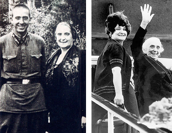 Izquierda: Dolores y su hijo, Rubén Ruiz Ibárruri, posan felices en un parque de Moscú ya iniciada la Segunda Guerra Mundial. Rubén murió combatiendo en Stalingrado el 14 de septiembre de 1942, siendo miembro del 62º Cuerpo del Ejército Rojo, durante una encarnizada batalla con los nazis en los alrededores de la Estación Central de la ciudad del Volga. Militante comunista como su madre, Rubén Ruiz recibió a título póstumo la más alta condecoración de la URSS, la de Héroe de la Unión Soviética. Derecha: Dolores saluda al lado de su hija Amaya a la llegada de ambas al aeropuerto de Madrid el 13 de mayo de 1977 en un vuelo de Aeroflot procedente de Moscú. Esta histórica imagen, primera página de todos los diarios de la época, simbolizó la nueva etapa política que se iniciaba en España y el final de 38 largos años de exilio para Pasionaria.