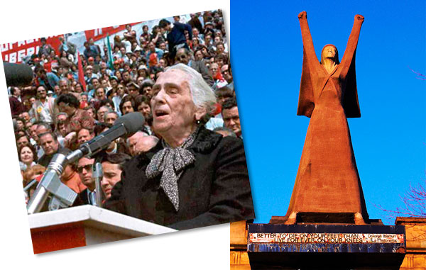Dolores se dirige al pueblo de Madrid durante un multitudinario mitin del PCE en 1977. A la derecha, monumento erigido en Glasgow, la mayor ciudad de Escocia y la tercera de Gran Bretaña, en homenaje a Pasionaria y a los cientos de voluntarios británicos (escoceses, galeses e ingleses) de las Brigadas Internacionales que derramaron su sangre por la República Española. Al pie del monumento se reproduce en inglés el texto: «»Más vale morir de pie que vivir arrodillado». Dolores Ibárruri, ‘La Pasionaria’».