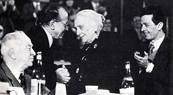 Dolores es saludada por Santiago Carrillo, secretario general del PCE, flanqueados ambos por Luigi Longo (izquierda), veterano mando de las Brigadas Internacionales en la Guerra de España y presidente de honor del PCI, y por Enrico Berlinguer, secretario general del PCI (derecha). Se trata de la mesa que presidió un gran acto de homenaje a Dolores en el Palacio de los Deportes de Roma, organizado por el principal partido de la izquierda italiana con motivo del 80º cumpleaños de Pasionaria en 1975. Dolores finalizó su intervención en Roma con un sonoro y profético «¡Hasta pronto en Madrid!».