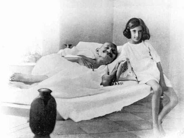 Mahatma Gandhi es visitado por la pequeña Indira —con apenas siete años en 1924— durante uno de los ayunos del líder de la independencia de la India en protesta contra el colonialismo británico. [Wikimedia Commons]