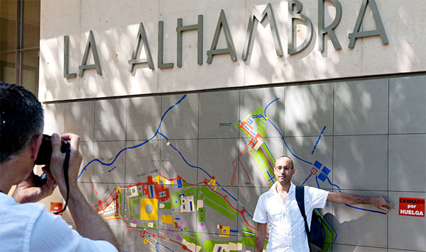 El monumento español más conocido internacionalmente, la Alhambra de Granada, también cerró sus puertas el 29-S con motivo de la Huelga General. Un turista posa a la entrada de este Patrimonio Cultural de la Humanidad señalando un adhesivo que reza «Cerrado por huelga». [EFE]