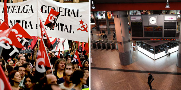 Un cortejo del sindicato CGT en Madrid (izquierda). A la derecha, el desolado aspecto que mostraba la estación de Atocha, el principal nodo de transporte metropolitano y de trenes de cercanías de Madrid, en plena «hora punta» a las 08:12 h (tal y como marca el reloj de RENFE que se ve en la foto sobre un panel que anuncia «Con motivo de la huelga…»). [EFE]