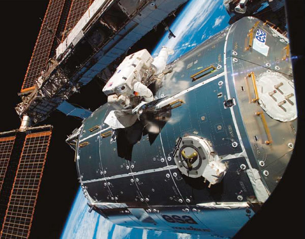 El astronauta alemán de la ESA Hans Schegel durante una EVA (Extravehicular Activity) en el exterior del laboratorio europeo Columbus de la Estación Espacial Internacional (ISS) en 2008.