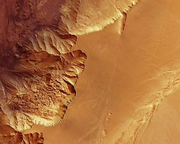Detalle de Melas Chasma, una región de Valles Marineris (Gran Cañón de Marte), fotografiado por la sonda interplanetaria europea Mars Express.