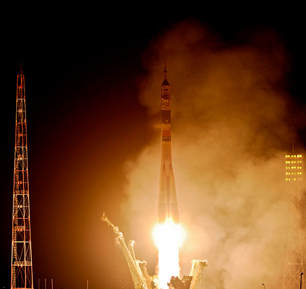 El lanzador Soyuz FG instantes después de su despegue de la rampa de lanzamiento del Cosmódromo de Baikonur con la nave tripulada Soyuz TMA-20 camino de la Estación Espacial Internacional (ISS).