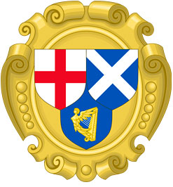 Derecha: escudo de armas de la República. A los colores de Inglaterra y Escocia se añade la lira como símbolo de Irlanda.