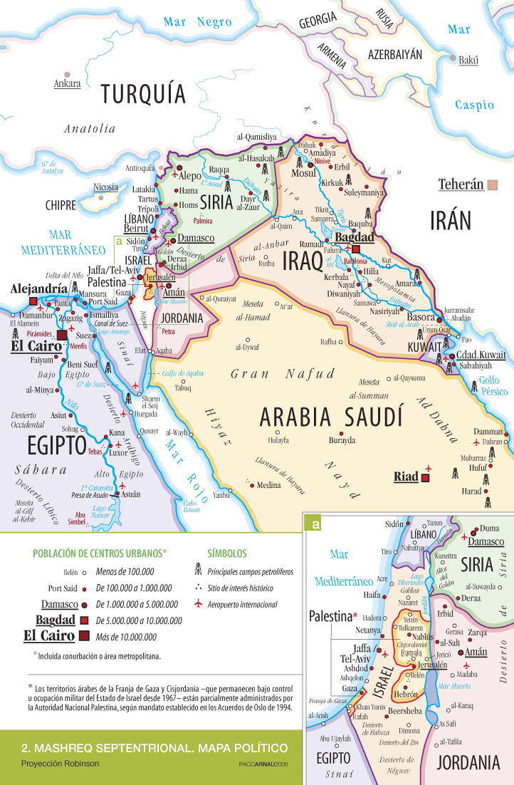 Información incluida en el mapa: Principales centros urbanos con referencia a su población; principales yacimientos petrolíferos; sitios de interés histórico; aeropuertos internacionales; hidrografía y orografía básicas; área ampliada (a) de Palestina (Israel, Gaza y Cisjordania).
