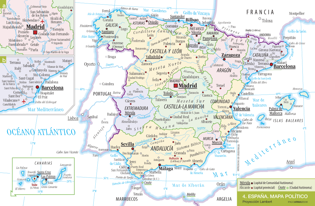 Información incluida en el mapa: Sendas ampliaciónes de áreas metropolitanas de Madrid (a) y de Barcelona (b); capitales de comunidades autónomas y de provincias; hidrografía y orografía básicas.