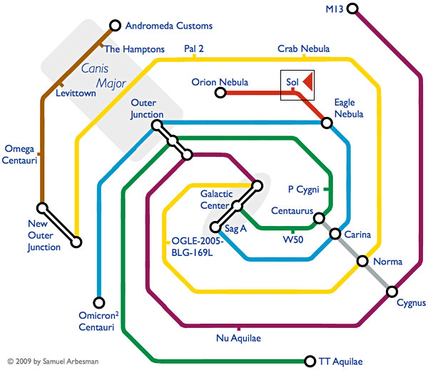 De igual forma que el universo real no gira en torno a la Tierra —a pesar de que doctrinas religiosas propalaron tal creencia falsa durante siglos—, nuestra estrella, el Sol, tampoco es el centro de nuestra galaxia, la Vía Láctea. Tanto el geocentrismo como el heliocentrismo, en este sentido, son igual de erróneos si nos atenemos a la realidad de nuestro entorno más cercano: una galaxia entre las miles y miles de millones que conforman el inmenso Cosmos, «más que granos de arena en todas las playas». El Sistema Solar está ubicado en el llamado Espolón de Orión del brazo de Sagitario de la Vía Láctea, una galaxia con una morfología de aspecto espiral. Tomando como centro de sus coordenadas al Sol, nos encontramos en una región de la Rama o Espolón de Orión del Brazo de Sagitario situada a más de 25.000 años/luz del verdadero núcleo galáctico y a unos 7.000 años/luz de otro de sus brazos espirales principales, el de Perseo. Si la Vía Láctea fuera el sistema de transporte metropolitano de una ciudad como Madrid, la estación de Sol («Puerta del Sol») no estaría en el centro geográfico, como podemos ver en la ilustración superior a cargo del diseñador gráfico Samuel Arbesman. A continuación podéis ver otra imagen, realizada por R. Hurt para el Instituto de Tecnología de California (JPL/NASA), que representa a la Vía Láctea vista desde fuera en un plano perpendicular. Giramos en torno a un núcleo que no conocemos en profundidad. Posiblemente se trata de un agujero negro.
