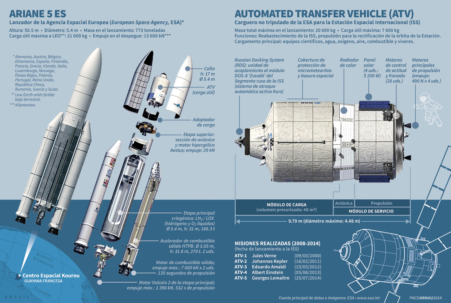 En 2014 ha sido lanzado el quinto y último carguero orbital europeo no tripulado ATV (Automated Transfer Vehicle), cerrándose así una etapa que se inició en 2008 con la llegada a la Estación Espacial Internacional (ISS) del ATV-1 Jules Verne. La infografía que presentamos muestra —mediante cinco ilustraciones y un centenar de datos— un resumen de las principales características del ATV así como la configuración de su lanzador, el Ariane 5 ES.
