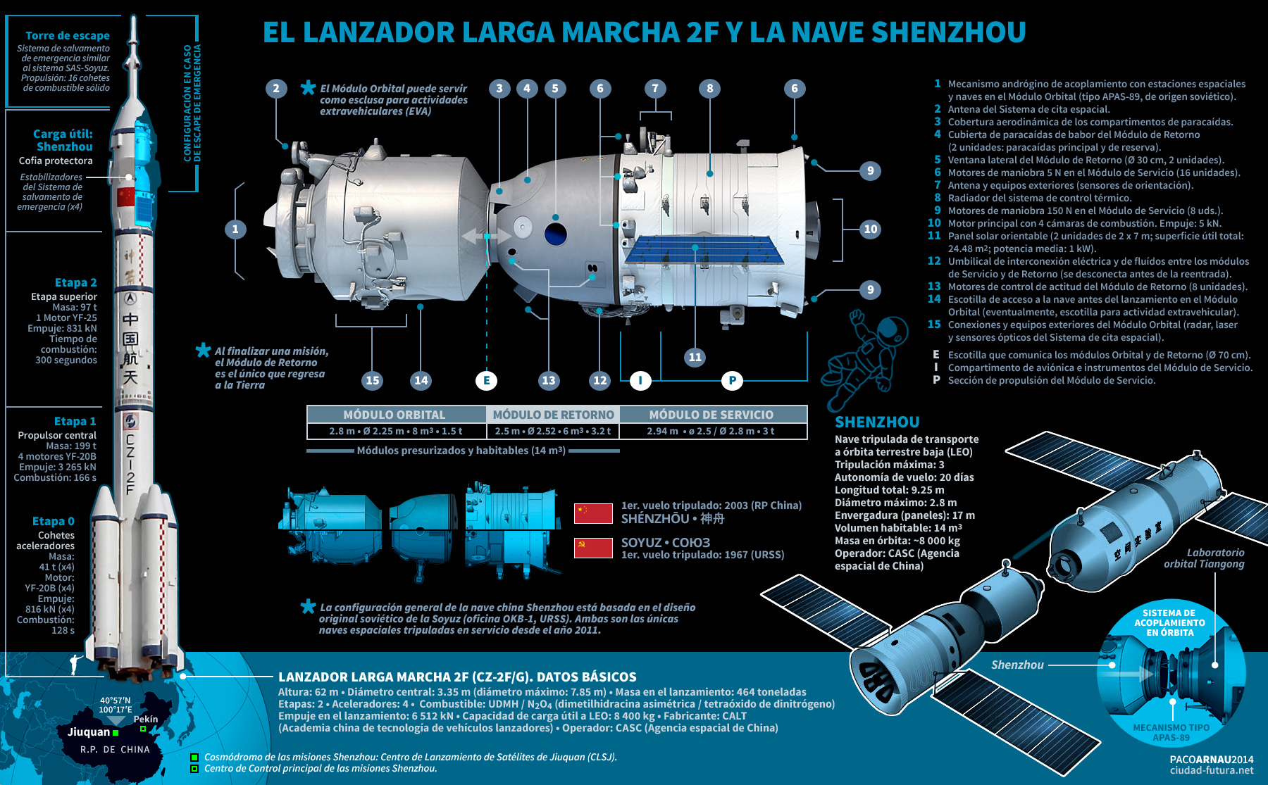 Infografía de gran formato sobre la configuración exterior del sistema de transporte espacial tripulado Larga Marcha-Shenzhou de la República Popular de China. Contiene las siguientes ilustraciones: