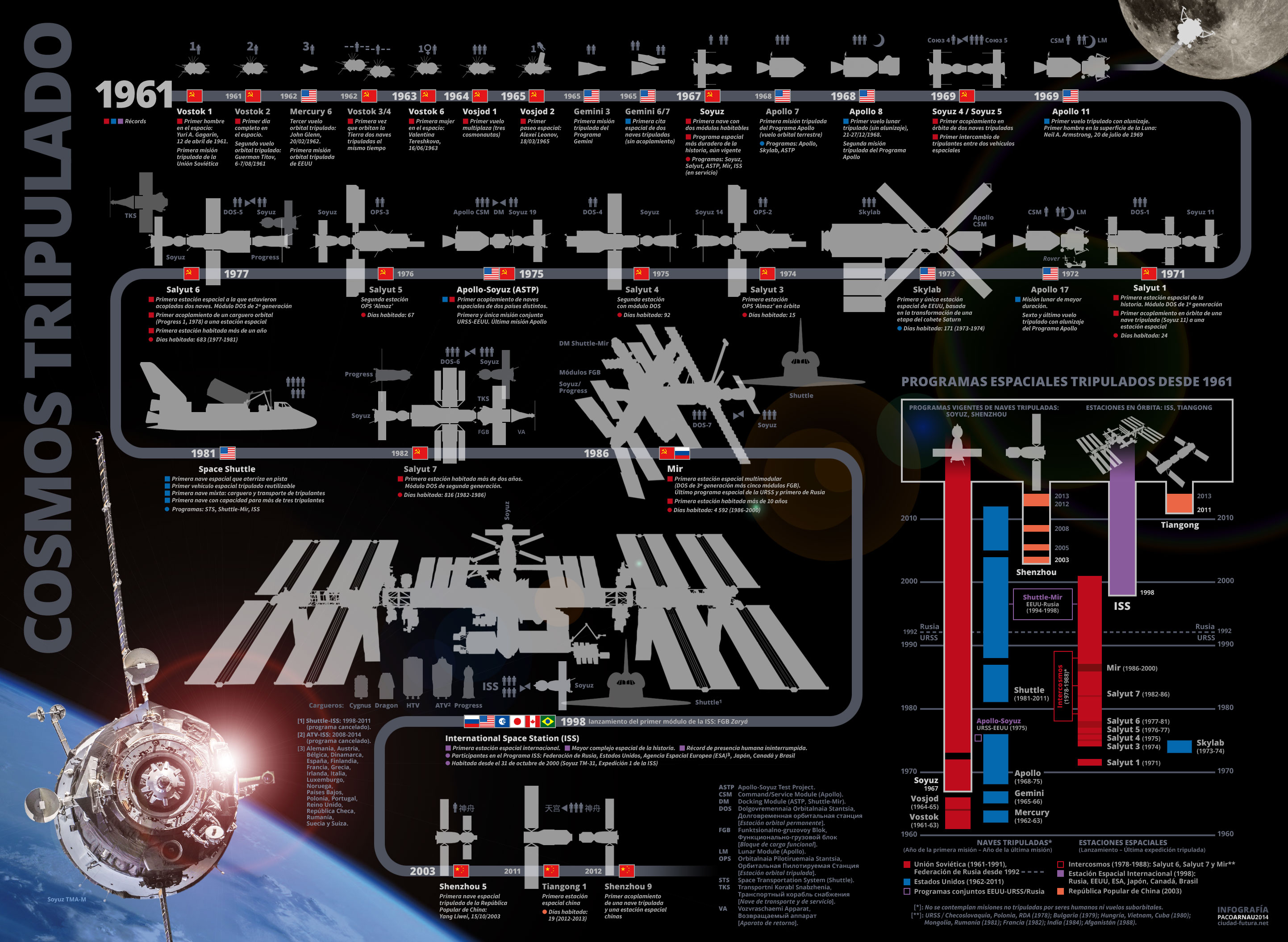 Un repaso a la historia de la cosmonáutica, el cosmos tripulado, desde los primeros pasos de la carrera espacial hasta la actualidad en una infografía de gran formato que incluye todos los programas que han transportado seres humanos al espacio con sus naves: Vostok (URSS), Mercury (EEUU), Vosjod (URSS), Gemini (EEUU), Soyuz (URSS), Apollo (EEUU), Space Shuttle (EEUU) y Shenzhou (China), sin olvidar la misión conjunta soviética-estadounidense Apollo-Soyuz; así como todos los programas de estaciones orbitales y esquemas de todas y cada una de las que han sido puestas en órbita: las seis estaciones de la serie Salyut (URSS), el Skylab (EEUU), la gran Estación orbital Mir (URSS-Rusia), la ISS (Estación Espacial Internacional), el mayor complejo espacial de la historia, y el laboratorio orbital Tiangong (China).