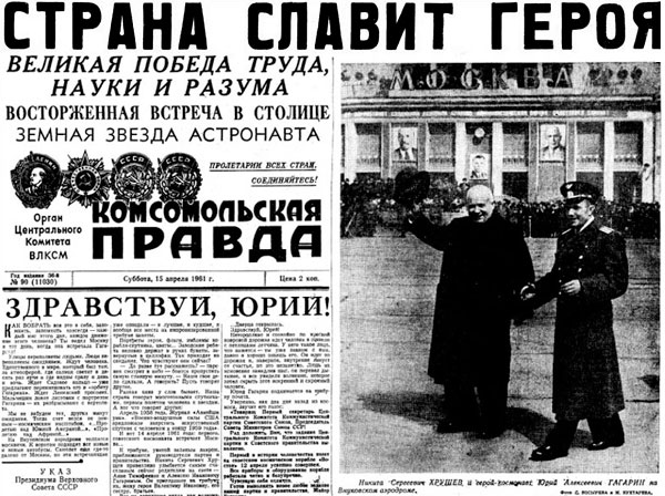 Sobre esta líneas os ofrecemos una imagen de indudable valor histórico: La primera página del rotativo de mayor tirada de la URSS, Komsomólskaya pravda (el diario de la Unión de Juventudes Comunistas soviéticas, KomSoMol) del día 15 de abril de 1961. Con motivo de la llegada de Yuri Gagarin a Moscú tras la realización de su pionera hazaña espacial, el titular superior a toda plana dice: «El país ensalza al héroe». Bajo la cabecera del periódico se titula a tres columnas: «¡Hola, Yuri!». La imagen muestra a un exultante Nikita Kruschev (a la sazón secretario general del PCUS y presidente del Consejo de Ministros de la URSS) en el momento de recibir a Gagarin en el aeropuerto de la capital soviética.