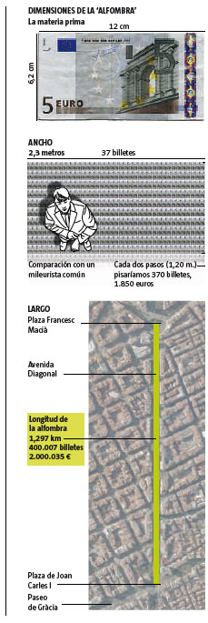 La propuesta de «arte conceptual» es que, en vez de gastar esos dos millones (y pico) de euros en el fallido referéndum, el Ayuntamiento podría haber optado por una acción mucho más vanguardista: peatonalizar la Avenida Diagonal con una alfombra azul compuesta de billetes de cinco euros «por donde pasearnos a reflexionar». ¿Sería posible, en la práctica, hacer esto? La respuesta es sí, sería posible alfombrar el tramo principal de la Diagonal desde la Plaza de Joan Carles I hasta la de Francesc Macià (paradójico inicio y final) con los dos millones de euros invertidos en la consulta. Un peatonal mileurista común pisaría cada dos pasos (~1,2 m) el valor de un salario digno (1.850 euros en 370 billetes de cinco) a través de un euro-carril de 2,3 metros de ancho. Al final de un trayecto de casi 1,3 kilómetros, el privilegiado mileurista común podría ser agasajado por la Corporación Municipal en pleno con una merecida jarra de cerveza subvencionada con el pico de euros sobrantes.