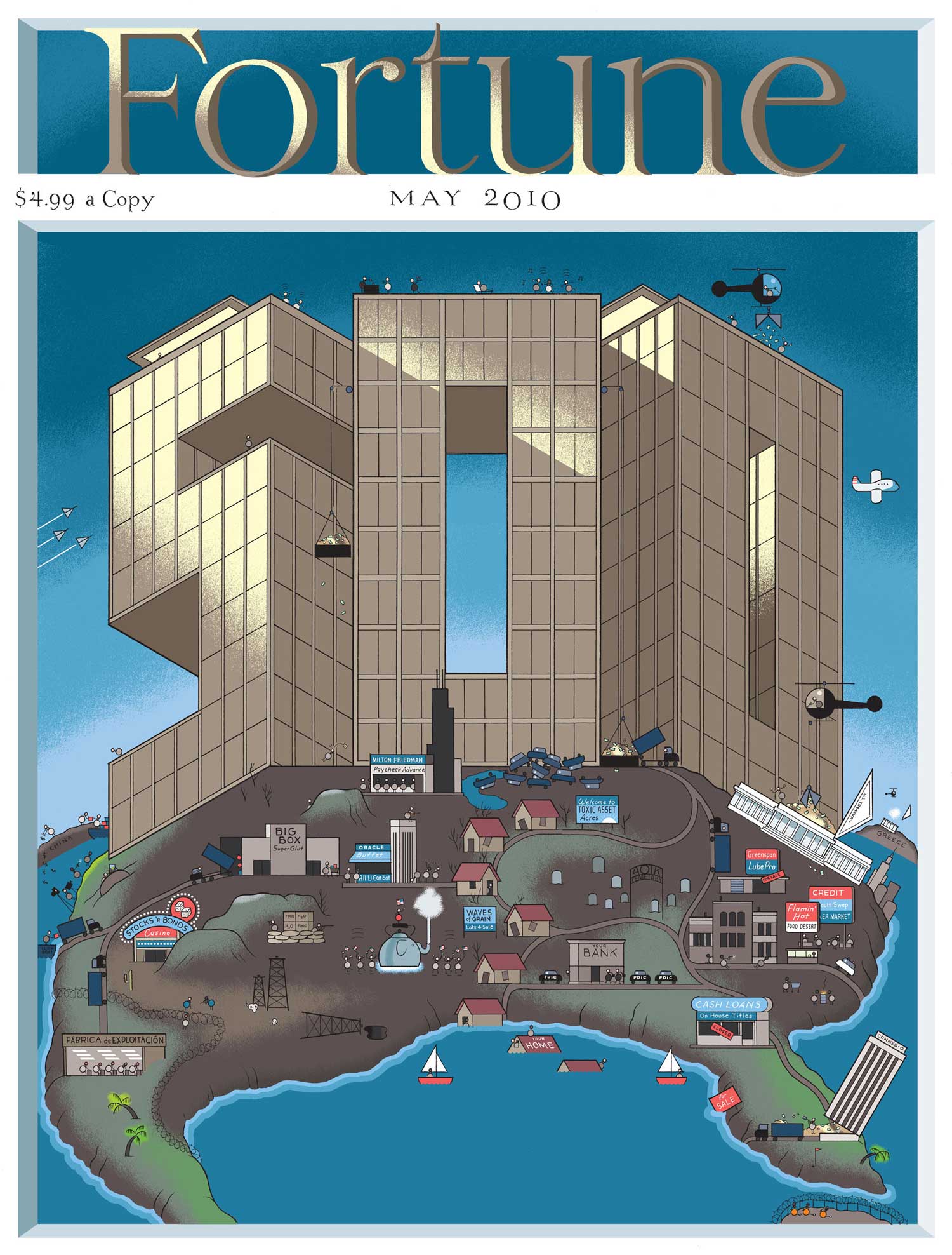 ↑ Esta es la propuesta de portada para el número especial de Fortune —diseñada por el artista gráfico estadounidense Chris Ware— que finalmente no vio la luz tras ser censurada por los editores de la revista económica norteamericana. [Imagen ampliada]