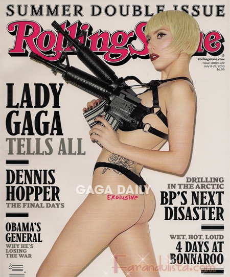 La cultura americana de masas, que vivió su edad de oro en el siglo pasado, con honrosas excepciones ya sólo es capaz de ofrecer al público —por regla general— subproductos comerciales de usar, tirar y olvidar pasando antes por caja. El culto a la violencia, la exaltación de la guerra como algo cotidiano y asumible, el feísmo como principal argumento formal, etc… han despojado a las manifestaciones culturales de contenidos éticos o estéticos y, por tanto, de una función social positiva, racional, crítica o emancipadora. Como muestra representativa de todo ello podemos ver sobre estas líneas la última portada del magazine estadounidense Rolling Stone correspondiente a este mes de julio de 2010, protagonizada por el producto de mercadotecnia Lady Gaga, creado ad hoc en los despachos de ejecutivos y comerciales para su consumo masivo. Producto que cuenta a su vez con la imprescindible colaboración de los medios de comunicación que lo promocionan machaconamente como un mantra. Fascismo visual puro y duro para descerebrados… con banda sonora.