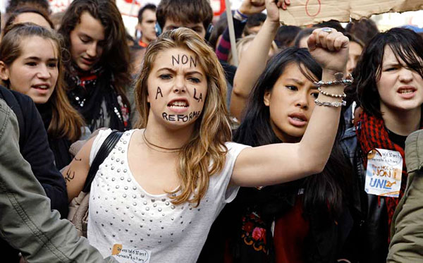 Estudiantes en la manifestación del sábado 16 de octubre de 2010 en París. Cientos de centros de enseñanza de toda la república están paralizados y bloqueados desde el viernes pasado. Multitud de estudiantes franceses se han unido con decisión y activismo a las movilizaciones obreras contra la reforma de las pensiones que pretende imponer el gobierno de Sarkozi. Mañana martes 19 de octubre está convocada una nueva jornada nacional de lucha coincidiendo con la presentación de la Reforma en el Senado de la República. [Foto: Reuters]