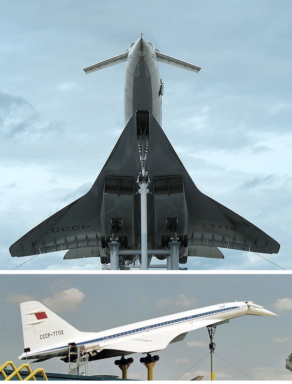 Unidad «CCCP-77112» (URSS-77112) del Tu-144 que se conserva actualmente en el Technikmuseum de Sinsheim (Estado federal de Baden-Wurtemberg, Alemania). En la imagen superior se pueden ver las toberas de los cuatro turborreactores de 20.000 kg de empuje cada uno que impulsaban esta aeronave soviética que podía volar hasta 18 km de altitud y 2.500 km/h. Además de su mayor tamaño y capacidad, otra de las diferencias entre el Concorde y el Tu-144 es que éste disponía de dos alerones delanteros —carnard— de geometría variable y retráctiles para aumentar la capacidad de elevación y maniobrabilidad en los despegues y aterrizajes, respectivamente. [Fotos: Gemeinde Sinsheim (superior) y Michail Jungierek (inferior)]