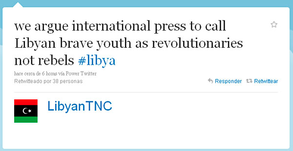 Los rebeldes libios, bien dotados de equipos informáticos desde un principio, combinaron su ofensiva militar con una fuerte presencia en las principales redes sociales —como Twitter (en la imagen) o Facebook— e insistieron en que se les definiera como «revolucionarios». Otro de sus principales argumentos es que el gobierno Libio atacaba a sus partidarios «desarmados», algo que parece contradictorio con la imagen anterior a ésta y muchas otras publicadas o televisadas. No obstante, ese mensaje desmentido por una realidad bien visible, fue masivamente difundido por estas redes en miles de ‘post’ y ‘tweets’. Éste ha sido seguramente uno de los fenómenos más ‘inexplicables’ desde los inicios de la Red Internet.