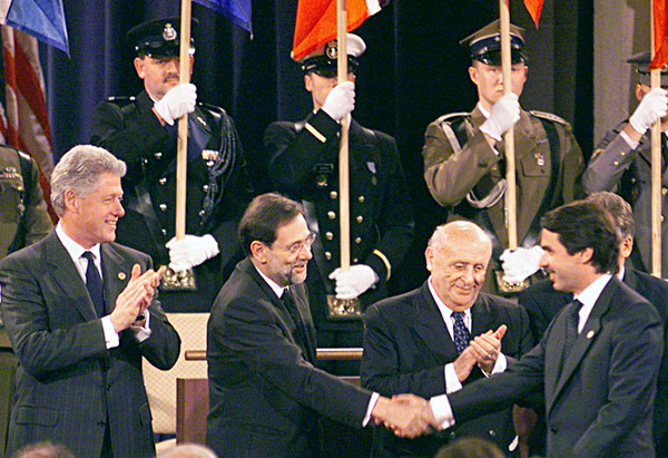 De izquierda a derecha: Bill Clinton, presidente de EEUU; Javier Solana, secretario general de la OTAN; Süleyman Demirel, presidente de Turquía y José María Aznar, presidente del Gobierno español, aparecen sonrientes durante la Cumbre de la OTAN celebrada en Washington con motivo del 50º aniversario de esta alianza militar en abril de 1999, en plena campaña de bombardeos sobre Yugoslavia causante de miles de muertos (38.000 misiones de combate en 10 semanas).